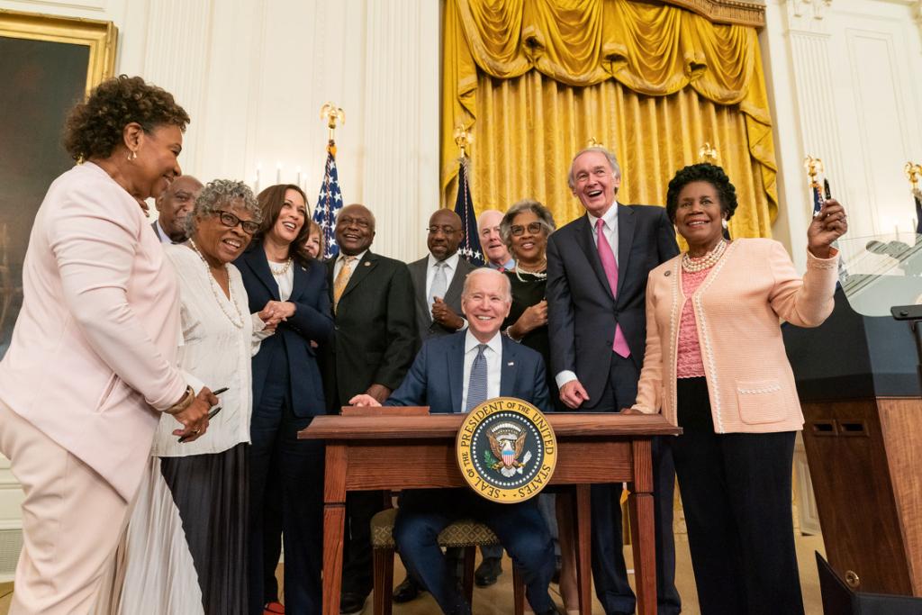 Tomorrow, Saturday, June 19th, marks our most recently enacted federal holiday, Juneteenth. After the bill swiftly made its way through Congress, President Biden signed the Juneteenth National Independence Day Act yesterday. The Act makes Juneteenth the 12th federal holiday and the first new federal holiday since 1983, when Dr. Martin Luther King, Jr. Day was established. Juneteenth commemorates the end of slavery, and much of the federal government was closed today to commemorate the new federal holiday. We wrote a blog post on Juneteenth a few years ago; for that post, see below.